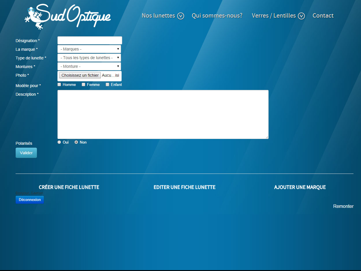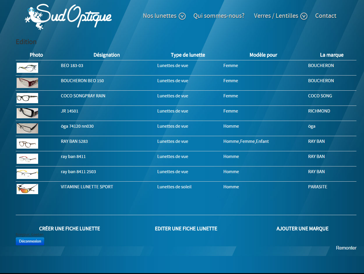 - clé en main : comme vous pouvez le voir sur les captures d'écran ci-dessous, nous leur avons mis en place une interface d'administration totalement épurée leur permettant de créer et d'éditer des fiches lunettes